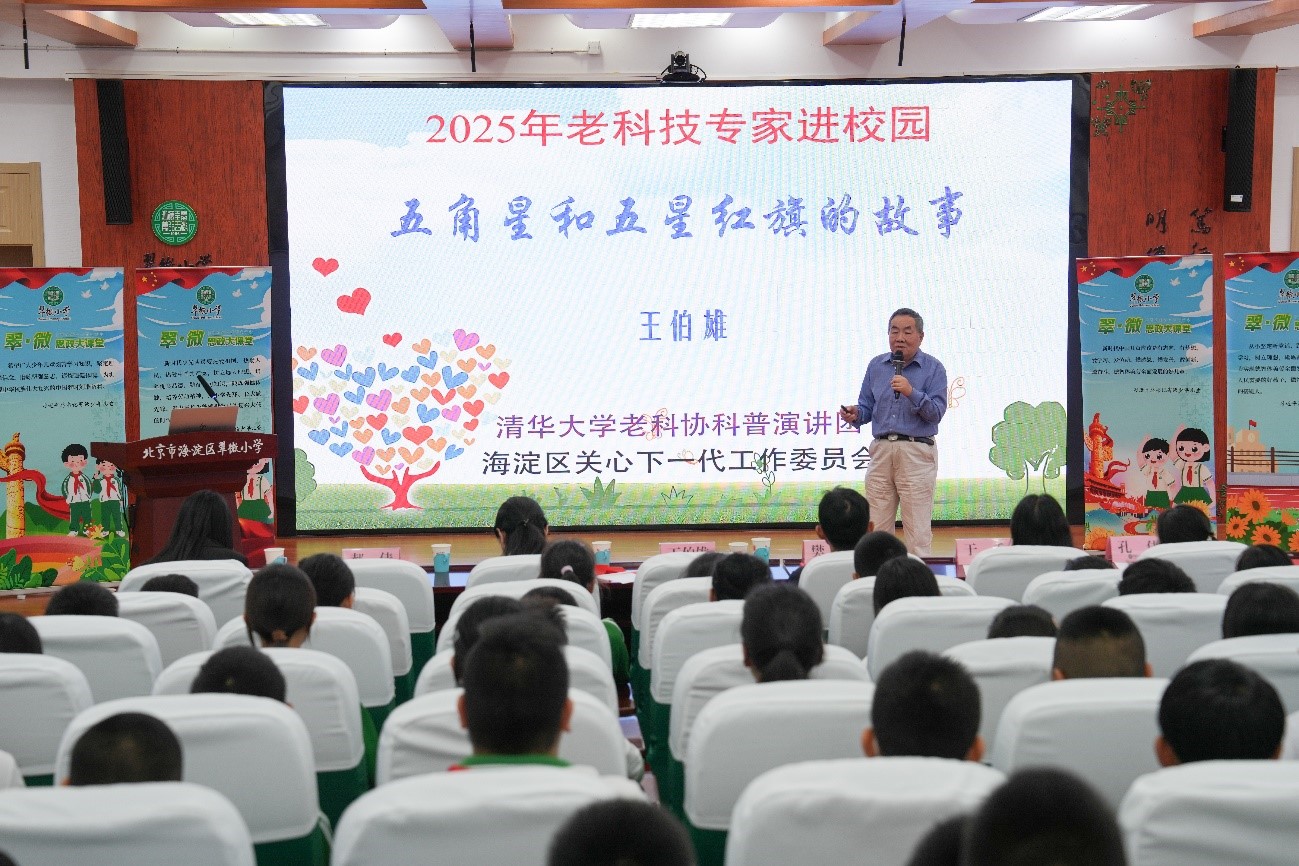 当日下午,作为该活动的重要一环,海淀区关工委“老科技专家进校园”系列科普活动承担单位之一,清华大学老科协科普演讲团专家王伯雄教授为北京市海淀区翠微小学进行了专题讲座《五角星和五星红旗的故事》。