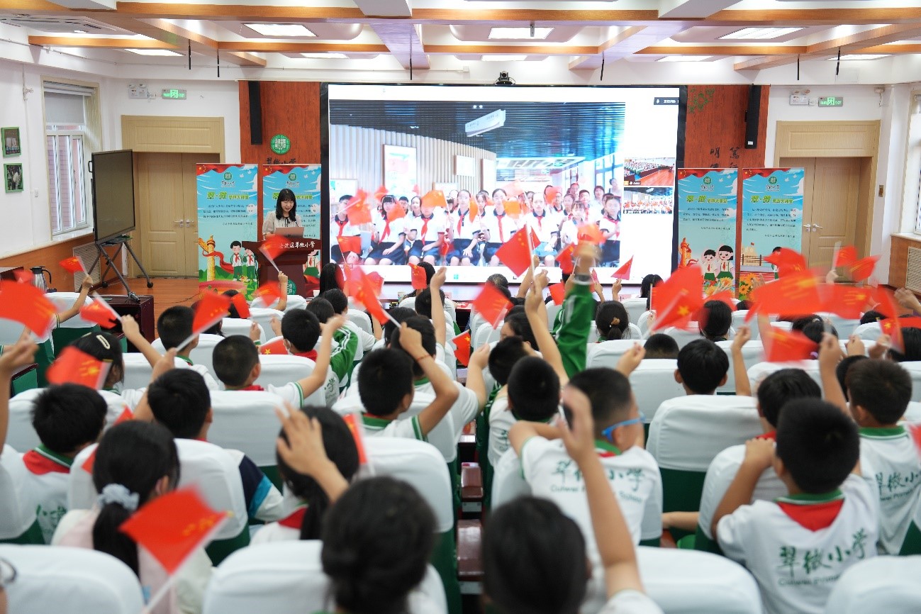 9月25日下午,北京市海淀区翠微小学教育集团联合浙江瑞安市委宣传部、清华大学老科协、瑞安市国旗教育馆,依托智慧数字云平台,与瑞安市红旗实验小学、贵州省平塘县克度第一小学跨越两千公里同屏共振,共同推出“国旗在我心中 礼赞伟大祖国”翠微思政大课堂爱国主义教育课,以实际行动落实习近平总书记“思政小课堂”与“社会大课堂”协同育人的重要指示。