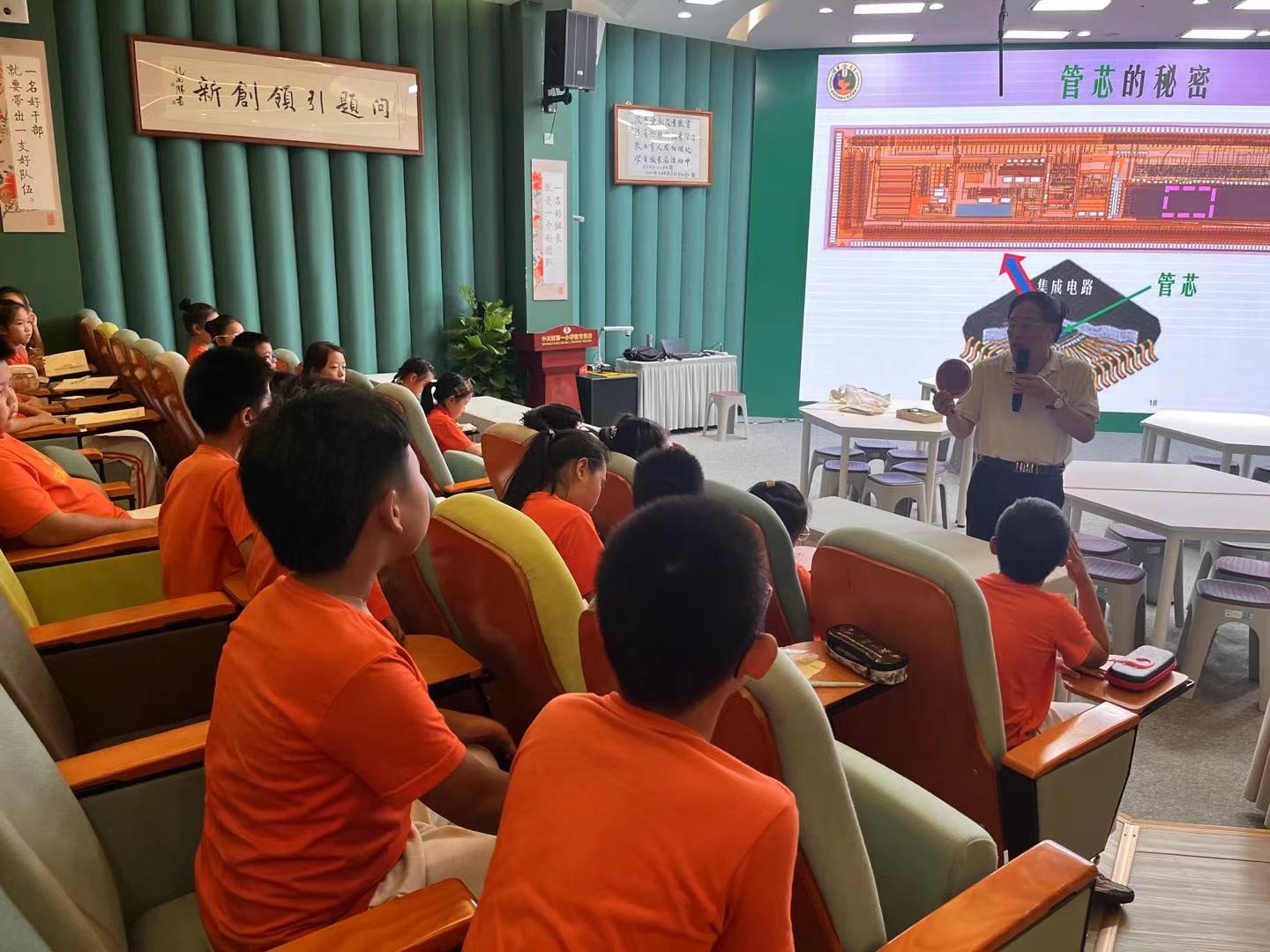王水弟教授用通俗易懂的语言,图文并茂的资料生动地讲解了芯片相关知识,使孩子们感受科技发展的魅力。讲座过程中,王教授以生活化比喻开篇,通过几十年前与当下的生活场景对比,让学生直观感知芯片技术对通讯、生活等领域的深刻变化。随后王教授用“人的头发丝粗细平均约 60-100 微米”,而“1 纳米等于十亿分之一米”这个长度概念,告诉同学们现在的芯片技术已经达到了几纳米的水平,让同学们了解现在芯片的最新技术。王教授讲述了晶体管替代电子管,进一步诞生了集成电路,让笨重的电视机、收音机等电子产品从 “大块头” 变成了 “便携式” 。他还结合同学们熟悉的手机,从手机内部的电路板,像“剥洋葱”一样,一层一层给同学们介绍了芯片内部的微观结构。