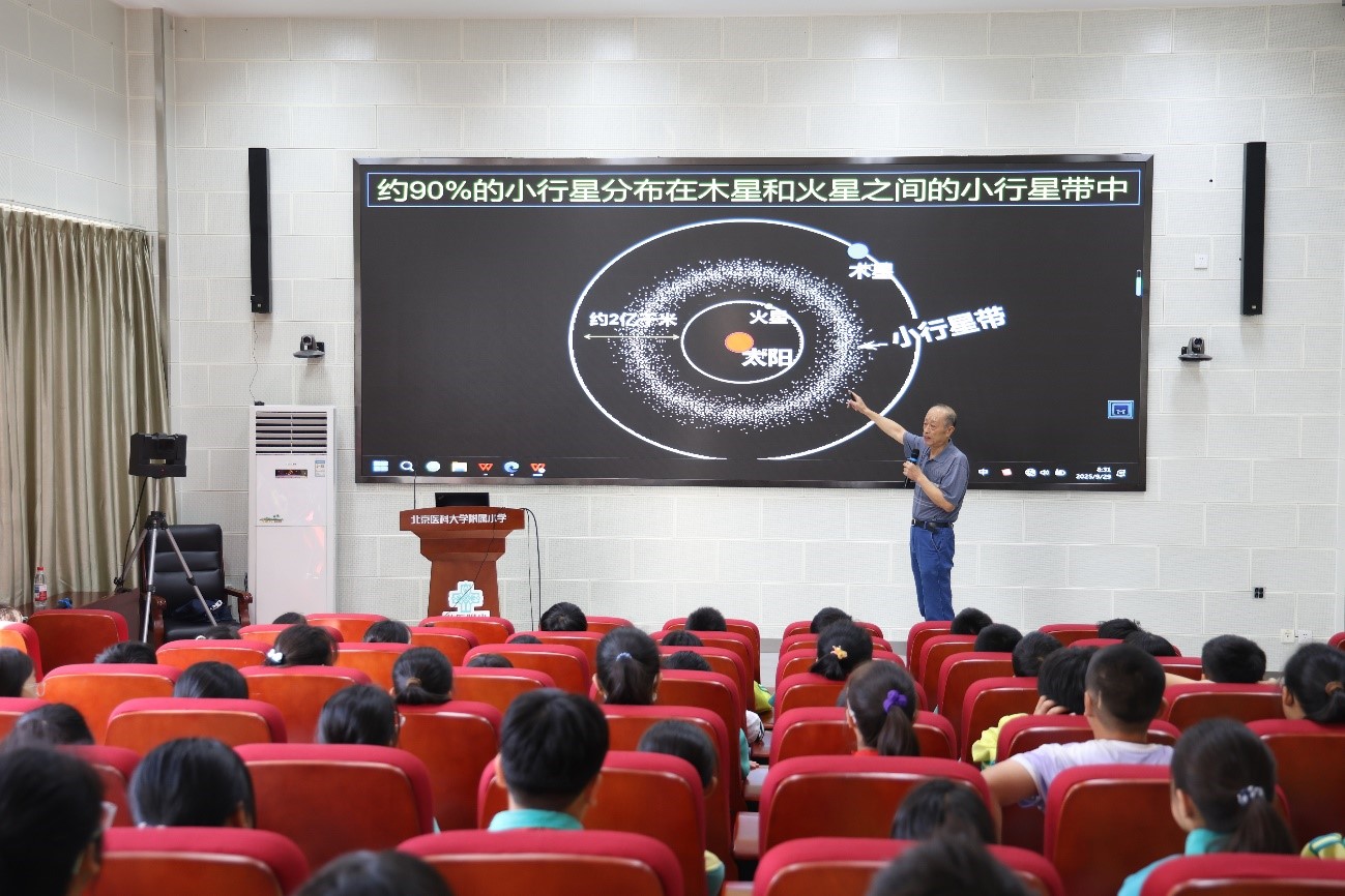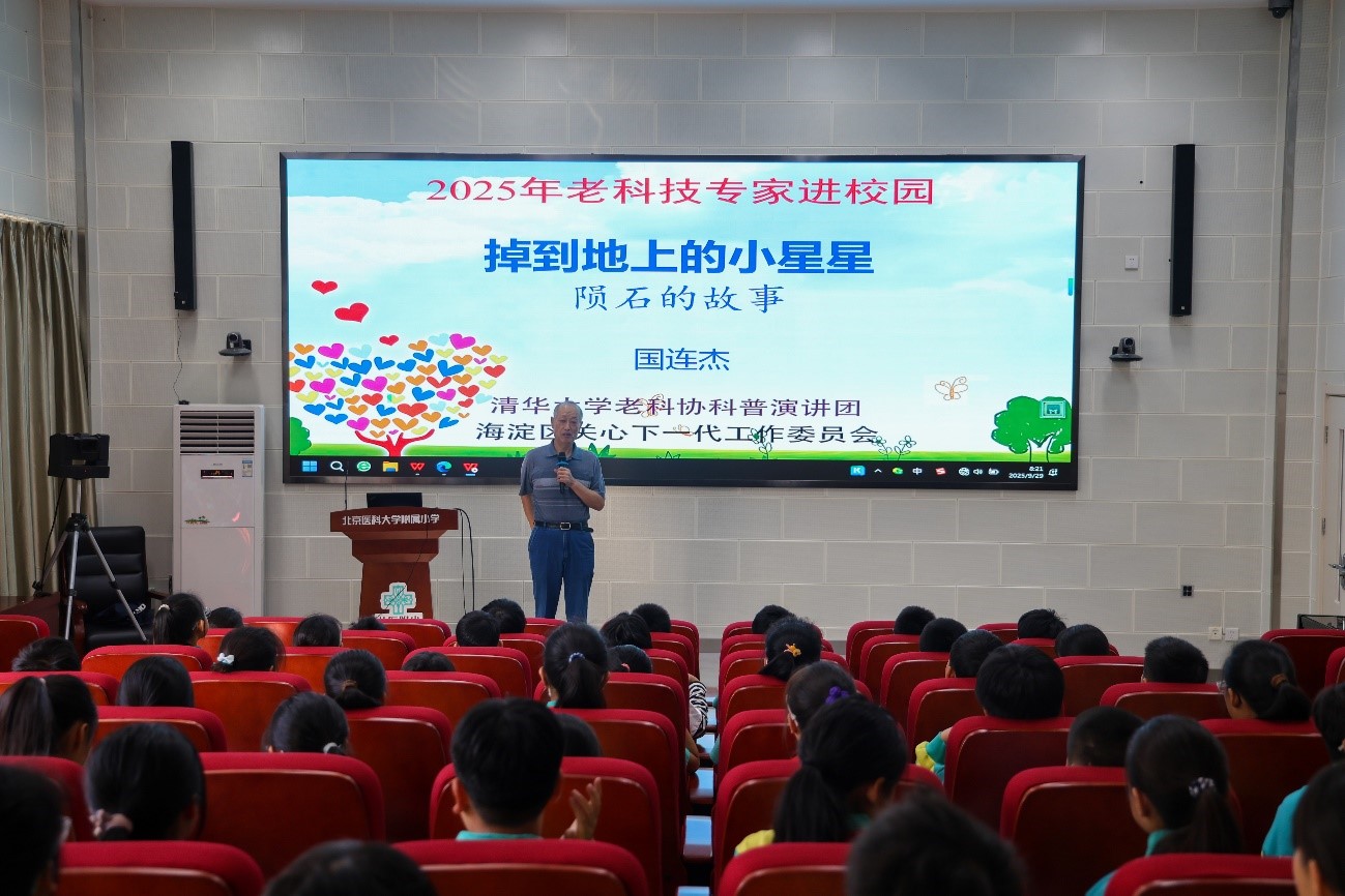 2025 年 9 月 29 日上午,海淀区关工委 “老科技专家进校园” 活动在北京医科大学附属小学顺利开展。清华大学老科协科普演讲团专家国连杰研究员为该校师生带来的是“掉到地上的小星星:陨石的故事”科普讲座,讲座采用线下线上方式, 120 名六年级同学现场参与,全校还有 1200 名学生通过直播同步聆听。
