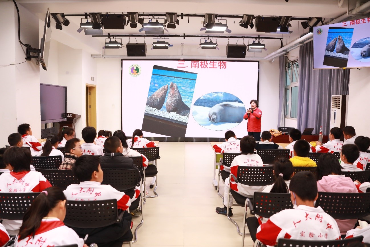 活动伊始,赵琦老师用通俗易懂、生动风趣的语言拉近了南极与校园的距离。“南极不仅是一片遥远的冰雪大陆,更是探索地球奥秘的重要窗口。” ,她话音刚落,屏幕上便浮现出南极的壮丽景象 —— 巍峨的冰川、幽蓝的冰山、成群结队的企鹅、翻腾的鲸鱼、浮冰上慵懒的海豹,一张张珍贵的实拍照片和录像资料,让孩子们仿佛身临其境。赵老师细致讲解了南极独特的生态环境,强调其对全球气候调节和生态平衡的关键作用,让孩子们明白这片 “人类最后一块净土” 的珍贵。