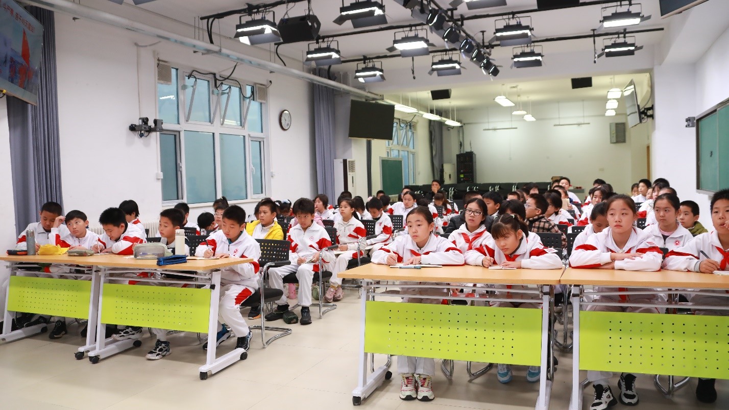 在互动环节中,现场的孩子们热情高涨,纷纷举手提问:“南极的企鹅会不会怕冷?”、“科考队员在南极吃什么呀?”、“采集冰芯有什么用呢?”孩子们的问题满是对南极世界的好奇与思考。赵老师细致入微地解答每一个疑问,巧妙结合报告中的知识点展开生动延伸,通过贴近孩子认知的鲜活案例,将抽象的科学知识转化为具体易懂的内容。孩子们聚精会神地听着,不时点头,现场交流氛围热烈融洽,充满探索的激情。