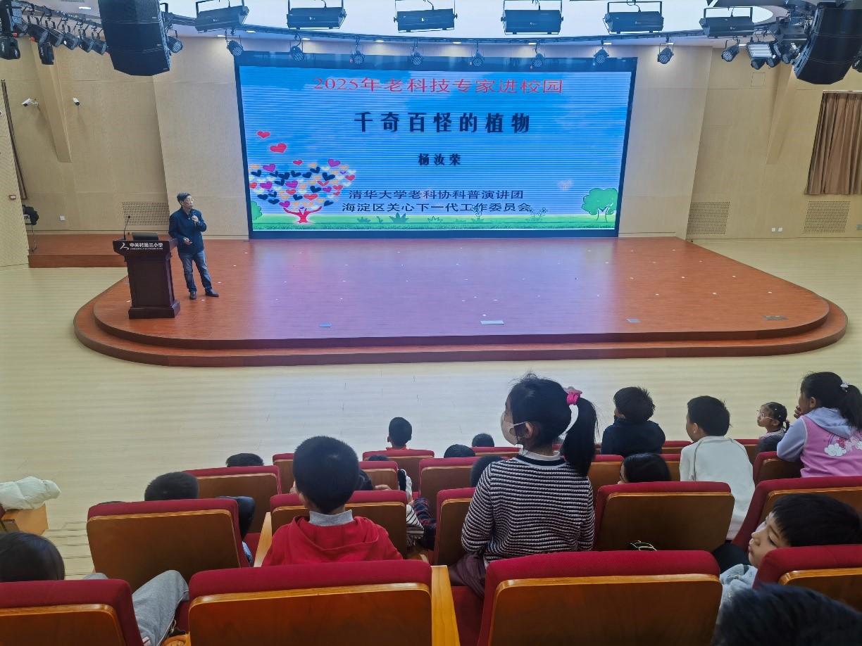 2025 年 11 月 18 日中午 ,清华大学老科协科普演讲团专家杨汝荣副研究员应邀走进海淀区中关村第三小学南校区,作了题为《千奇百怪的植物》的讲座,为该校一年级至三年级2000名孩子开启了一场奇妙的植物科普之旅。本次活动采用线下(125人)现场聆听 、线上(1875人)同步收看的形式,使全校低龄段孩子沉浸在“植物世界奥秘”的探索中。该讲座是海淀区关工委“老科技专家进校园”科普系列活动的组成部分,旨在进一步提升海淀区青少年科学素养,积极储备科技创新后备力量。
