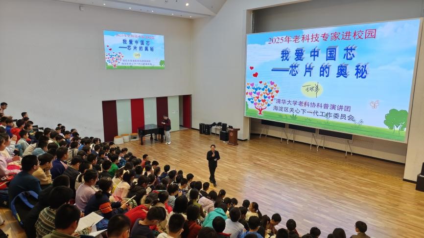 2025年11月22日,清华大学清华大学老科协科普演讲团专家王水弟教授应邀走进北大附中,为该校正在进行的“北大附中教育集团物理卓越人才培养学科营”的180位小学六年级和初一年级学生带来题为《我爱中国芯——芯片的奥秘》的专题讲座。王教授从生活中常见的小小芯片讲起,带领大家走近“大国重器”背后的科学与工程世界。该讲座是海淀区关工委“老科技专家进校园” 科普系列活动之一,旨为进一步提升海淀区青少年科学素养,积极储备科技创新后备力量。