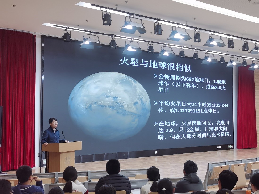 报告伊始,钱航研究员以“人类为何执着于火星探索”为引,结合自身参与探月探火等重大航天工程的亲身经历,将遥远的火星探测任务转化为一个个鲜活可感的科学故事。从“祝融号”火星车成功着 陆时的精准测控,到火星表面地形地貌的科学解读;从航天器自主导航技术的突破,到星际通信面临的挑战与解决方案,他用通俗易懂的语言拆解复杂航天原理,用硬核数据展现中国航天的硬核实力,让同学们直观感受“上九天揽月,下五洋捉鳖”的航天浪漫与科技力量。