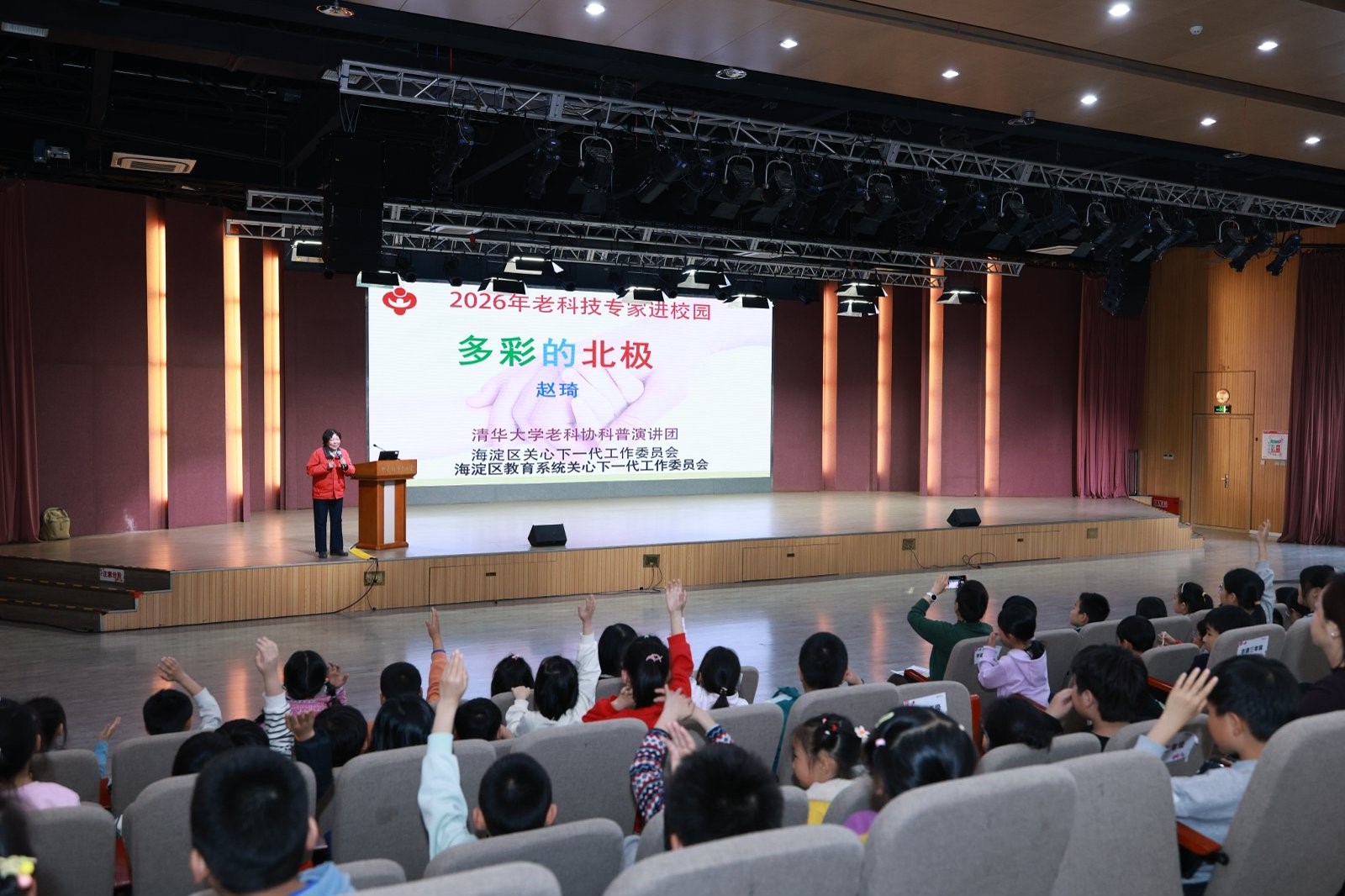 2026年3月27日下午,清华大学老科协科普演讲团赵琦教授来到海淀区中关村第二小学百旺校区,为该校200位一至三年级的孩子们作“多彩北极”的科普演讲活动。该活动是海淀区关工委、海淀区教育系统关工委联合清华大学老科协科开展的“老科技专家进校园”系列科普讲座之一,旨在进一步提升海淀区青少年科学素养,积极储备科技创新后备力量和传承科学精神、厚植爱国情怀。